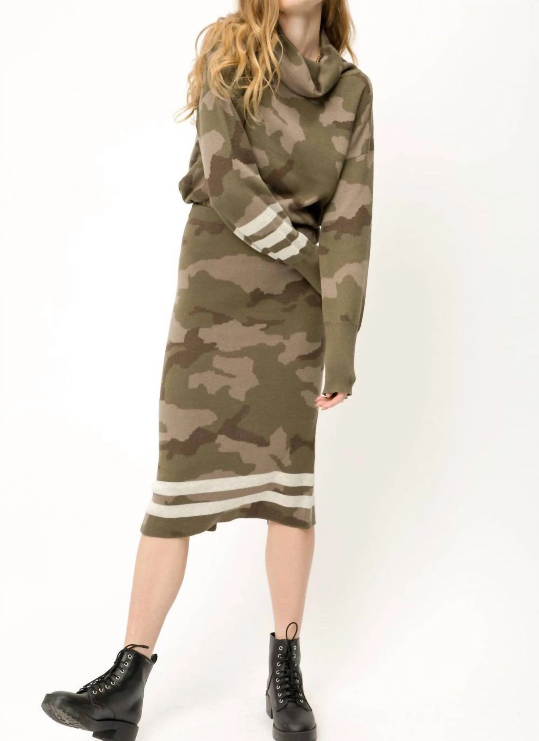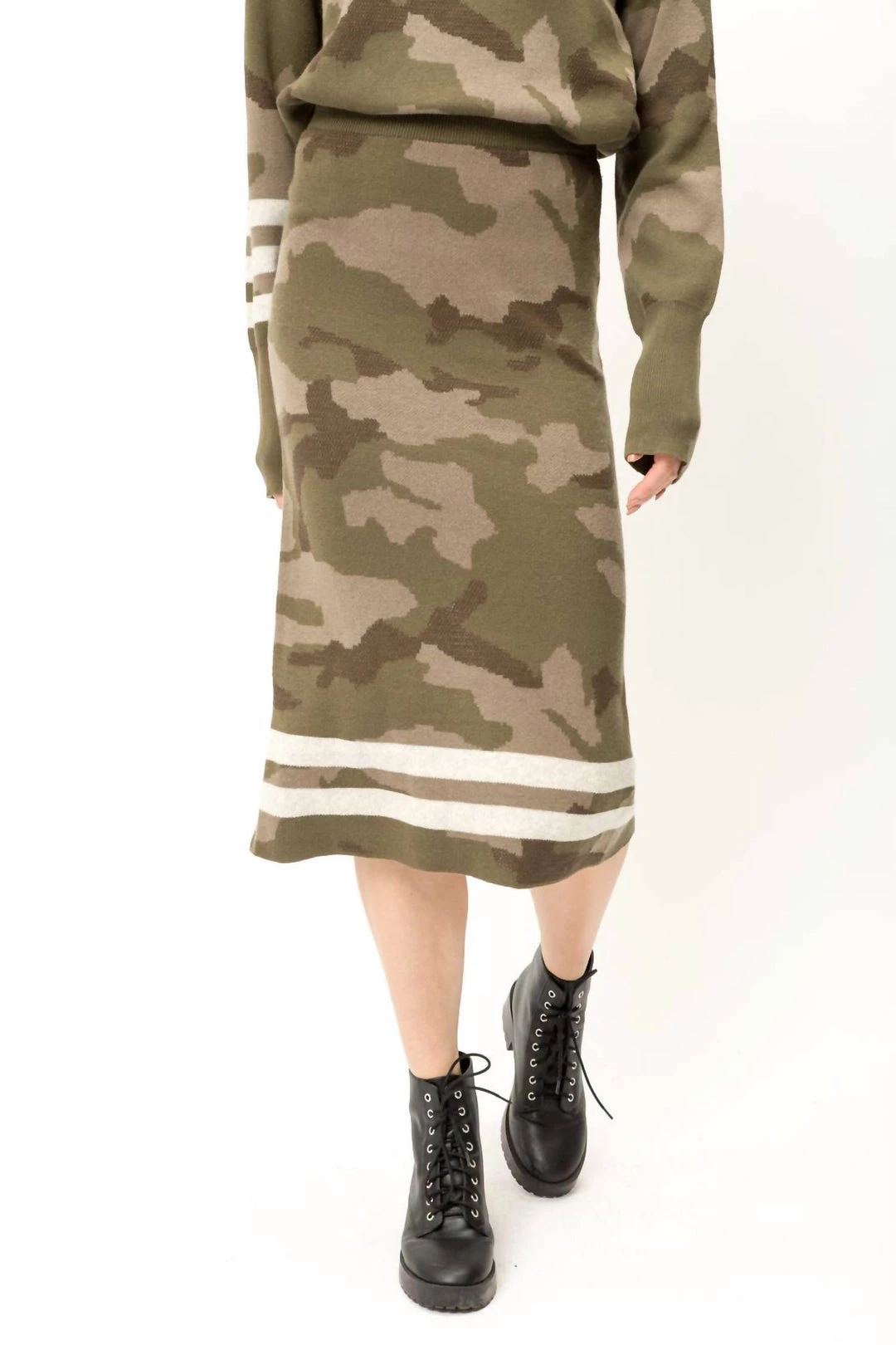 Camouflage Sweater Skirt with Stripe DetailElastic waist bandBack slit hemStripes detail-Model is wearing with matching Camo Crop Sweater.-100% Cotton-Model wears – S / Model height – 5′ 9″SMALL 2-4MEDIUM 6-8LARGE 10-12